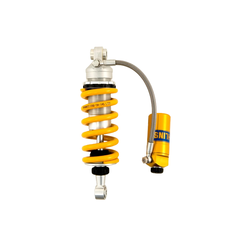 Amortiguador Öhlins S46HRC Monotubo 46 mm, presurizado con depósito de nitrógeno, con tubo separado, eje de 16 mm y ajustable en compresión y rebote.