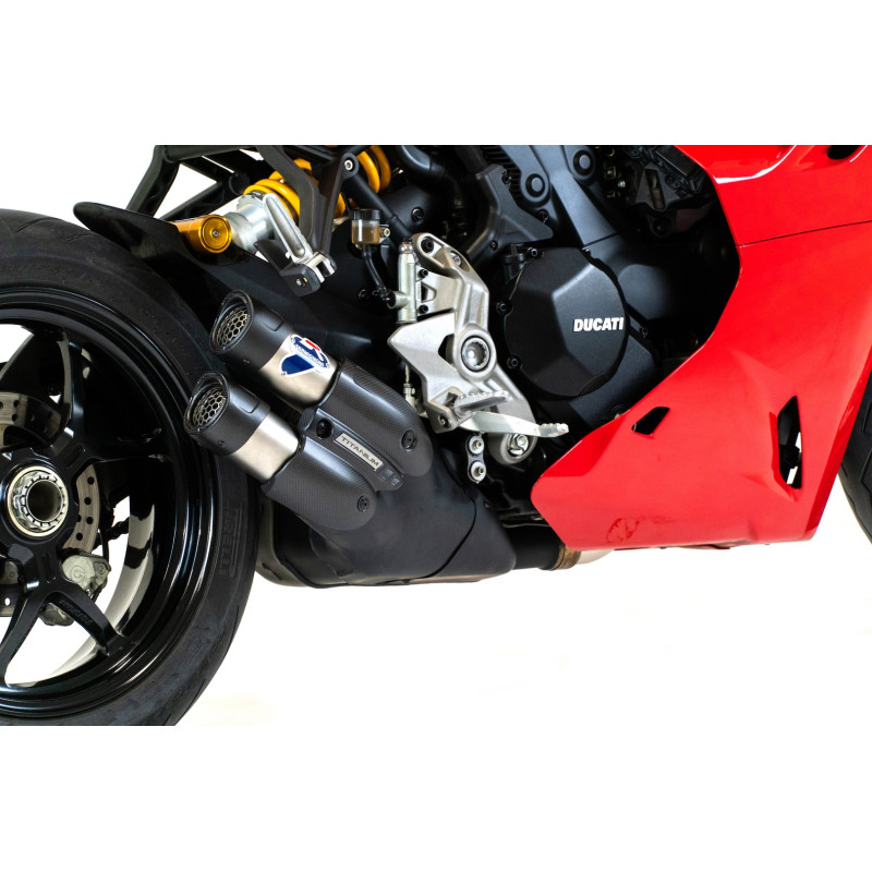 Termignoni presenta un nuevo silenciador homologado diseñado exclusivamente para la DUCATI SUPERSPORT 950. Este doble silenciador cuenta con tapas de carbono y una funda exterior de titanio, lo que reduce significativamente el peso y mejora el rendimiento. Resistencia excepcional a altas temperaturas, proporcionando durabilidad y un rendimiento óptimo para tu DUCATI. Mejora tu conducción con el silenciador de última generación de Termignoni para una experiencia de motociclismo superior.